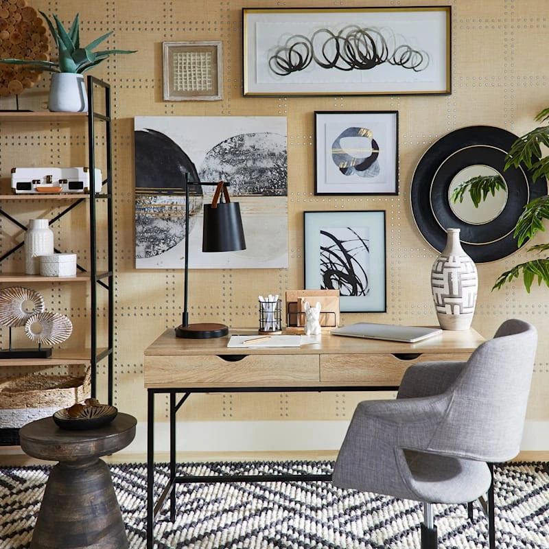 Modern farmhouse meets At Home prices in Honeybloom, our exclusive new brand that celebrates life lived together. Whether finishing off your office space or repurposing that open corner space in the dining room, every workspace is defined by a good desk. Create a space tailor-made for your work style with our Burnaby writing desk, a perfect modern rustic touch in any room where it�s put to work. Crafted from metal in a solid black finish, this piece nestles a wood and faux wood work surface in a light natural finish. Two drawers with open slit pulls give you storage options for all your office essentials.