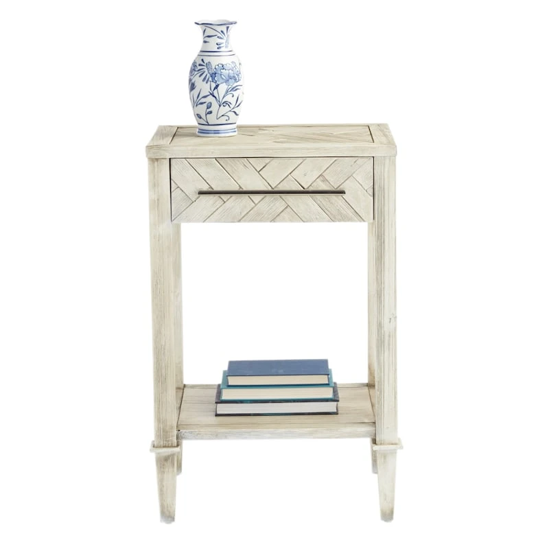 Our beautiful Kate Parquet side table has a whitewashed distressed finish and is perfect to showcase in any bedroom or next to your favorite chair in the living room. To keep the genuine rustic look the front drawer features an interesting basketweave, parquet look that matches the top. The modern bar pull on the drawer adds to the character of this one-of-a-kind piece and makes it a contender for both modern or farmhouse settings.